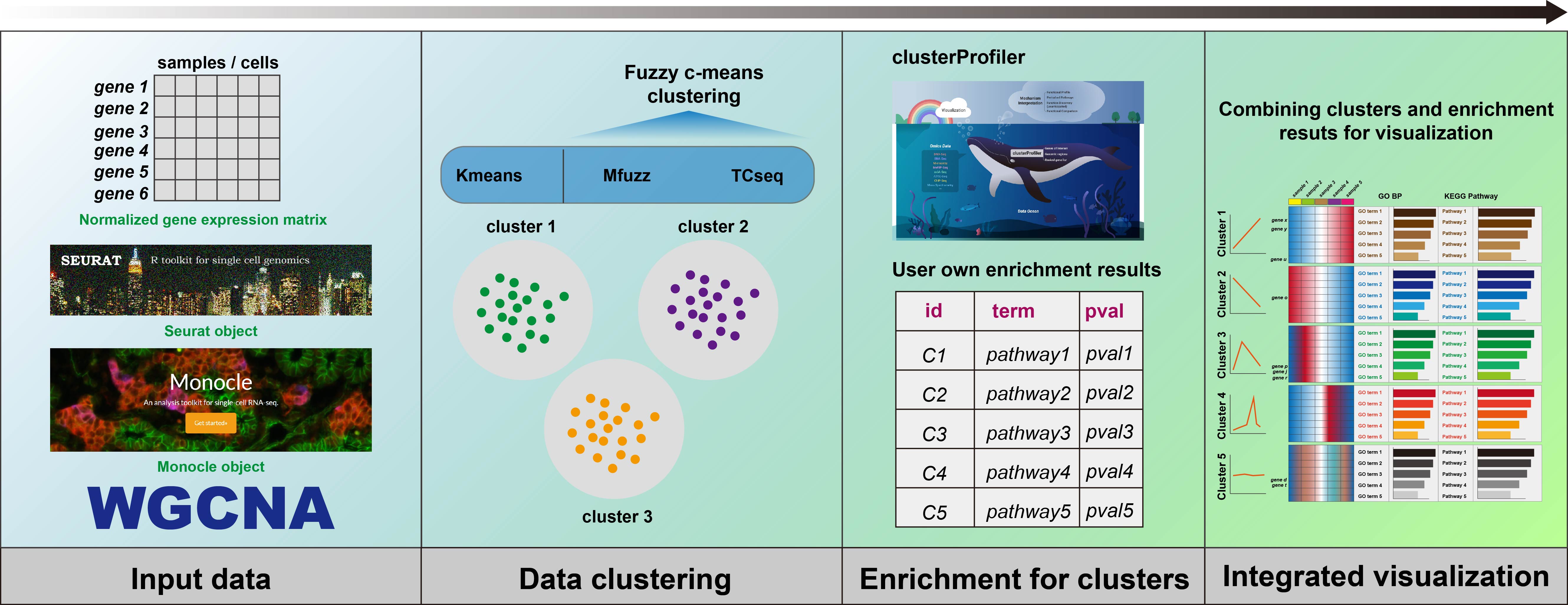 To enhance clustering and visualization of time-series gene expression data from RNA-Seq experiments, we present the ClusterGVis package. This tool enables concise and elegant analysis of time-series gene expression data in a simple, one-step operation. Additionally, you can perform enrichment analysis for each cluster using the enrichCluster function, which integrates seamlessly with clusterProfiler. ClusterGVis empowers you to create publication-quality visualizations with ease.