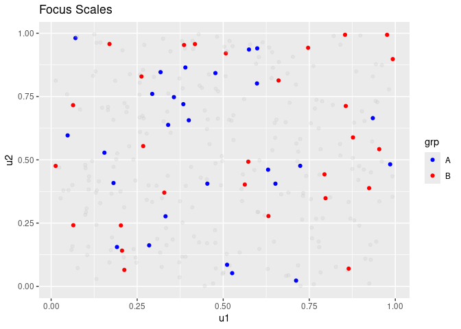 Suppose that we are mainly interested in groups A and B, but we do not want to lose the u1 and u2 information from other groups. Visualizing with focus on observations such that grp is A or B is shown below.
