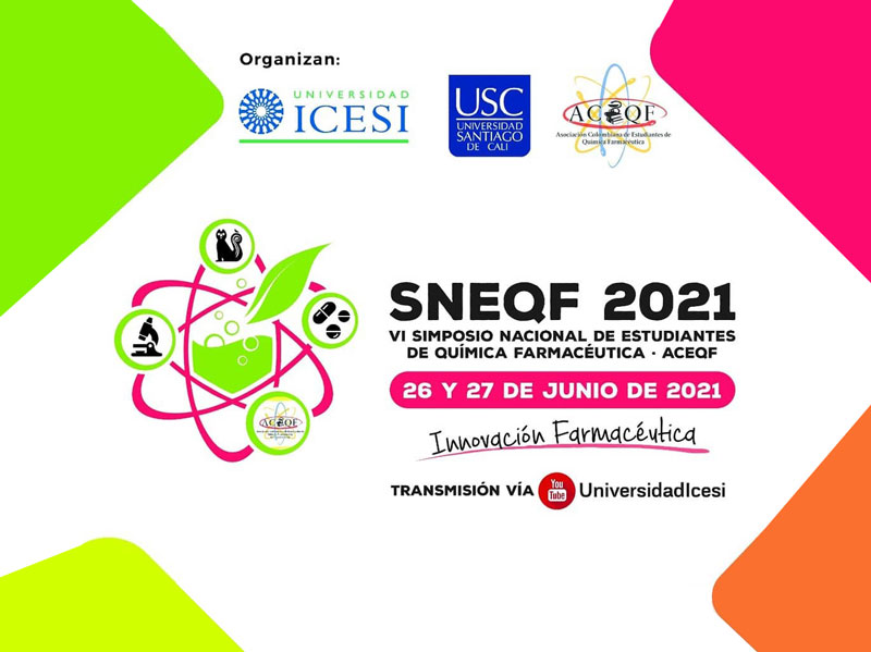 La Asociación Colombiana de Estudiantes de Química Farmacéutica, ACEQF, Seccional Valle, con el apoyo de los programas de Química Farmacéutica de la Universidad Icesi y Universidad Santiago de Cali invitan este 26 y 27 de junio a participar del VI Simposio Nacional de Estudiantes de Química Farmacéutica, el cual tiene como objetivo generar un espacio académico que permita a los estudiantes, profundizar en temas propios del ejercicio profesional e investigativo del Químico Farmacéutico. Inscríbete aquí https://rb.gy/5o31yd