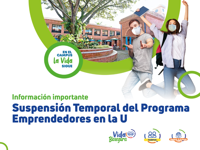 Estimados y estimadas estudiantes, les recordamos que el programa de Emprendedores en la U continúa suspendido temporalmente en cumplimiento a la Resolución 777 del 2021 expedida por el Ministerio de Salud, por medio de la cual se adopta el Protocolo General de Bioseguridad para prevenir el contagio por COVID-19.