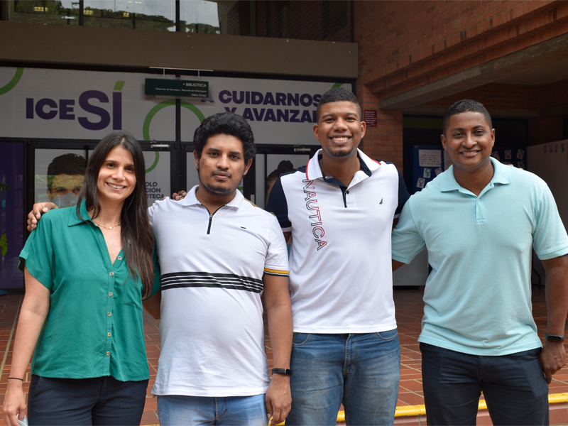 De izquierda a derecha: Carolina Orozco, directora del programa de Ingeniería Bioquímica, Juan José García, estudiante de Ingeniería Bioquímica, Víctor Yanala, estudiante de Ingeniería Bioquímica, José Luis Gamarra, profesor Departamento de Matemáticas y entrenador del Equipo de Olimpiadas de la Universidad Icesi.