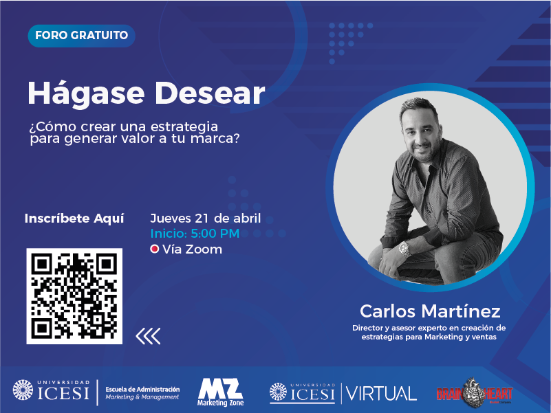Marketing Zone e Icesi Virtual invitan este jueves 21 de abril a las 5:00 p.m., al foro gratuito Hágase Desear ¿Cómo crear una estrategia para generar valor a tu marca?, que tendrá como invitado especial a Carlos Martínez director estratégico y asesor en estrategia para diferentes compañías a nivel nacional e internacional para las que se desarrollan sistemas aceleradores de resultados para el marketing y las ventas. El foro será transmitido a través de la plataforma Zoom y de manera presencial, en Marketing Zone (109 A).