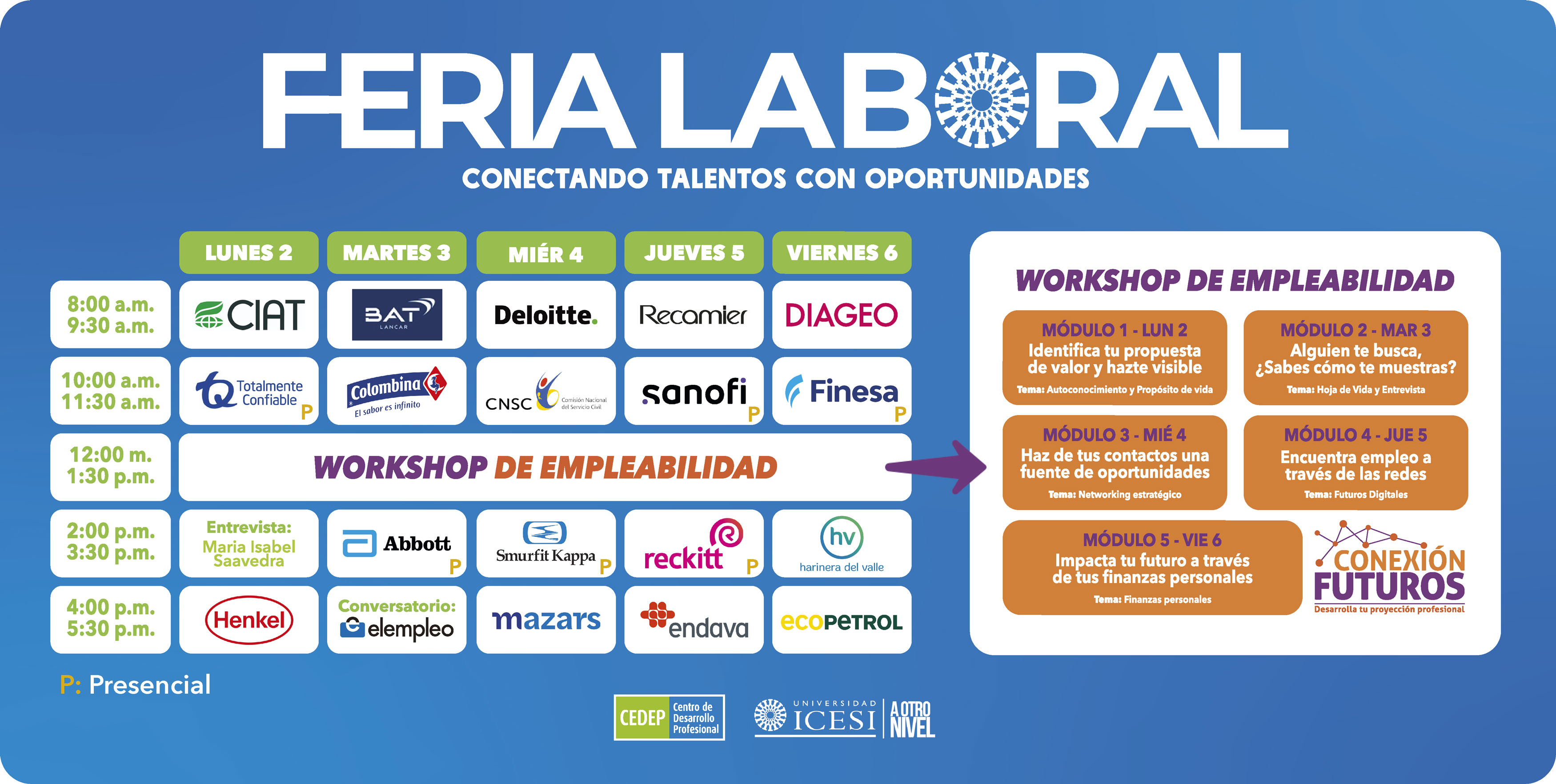 Los participantes encontrarán, durante los días del evento, ofertas publicadas exclusivamente para ellos a través de la Bolsa de Empleo de Icesi. Además, en las fechas mencionadas se ofrecerán charlas empresariales con expertos en temas de selección de 15 organizaciones.