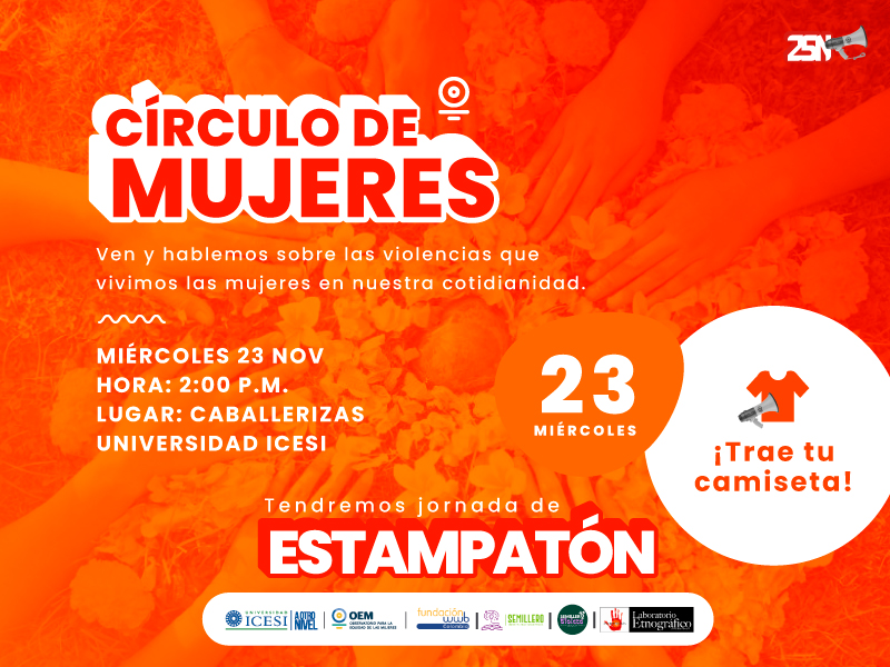 El Observatorio para la Equidad de las Mujeres, OEM, invita a la comunidad Icesi a sumarse a la agenda por motivo del 25 N, Día Internacional de la Eliminación de la Violencia contra la Mujer. Las actividades de la agenda se han organizado conjuntamente con el Semillero Violeta: violencia, género y sexualidad, el Semillero Género, Política y Espacio Público y el Laboratorio Etnográfico.