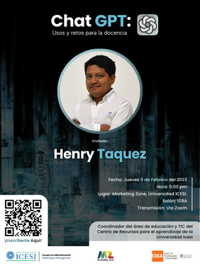 Marketing Zone invita el próximo jueves, 16 de febrero a las 5:00 p.m., en el salón 109 A, al foro Chat GPT y sus Implicaciones Pedagógicas, que profundizará sobre el las ventajas y desventajas de la inteligencia artificial en la educación. El foro tendrá como invitado especial a Henry Taquez, profesor de la Escuela de Ciencias de la Educación y coordinador del área de educación y TIC del Centro de Recursos para el aprendizaje de la Universidad Icesi. El profesor Taquez expondrá su perspectiva y experiencia con relación a estas tendencias y sus aplicaciones. Inscríbete al foro aquí https://www.icesi.edu.co/e/ChatGPT