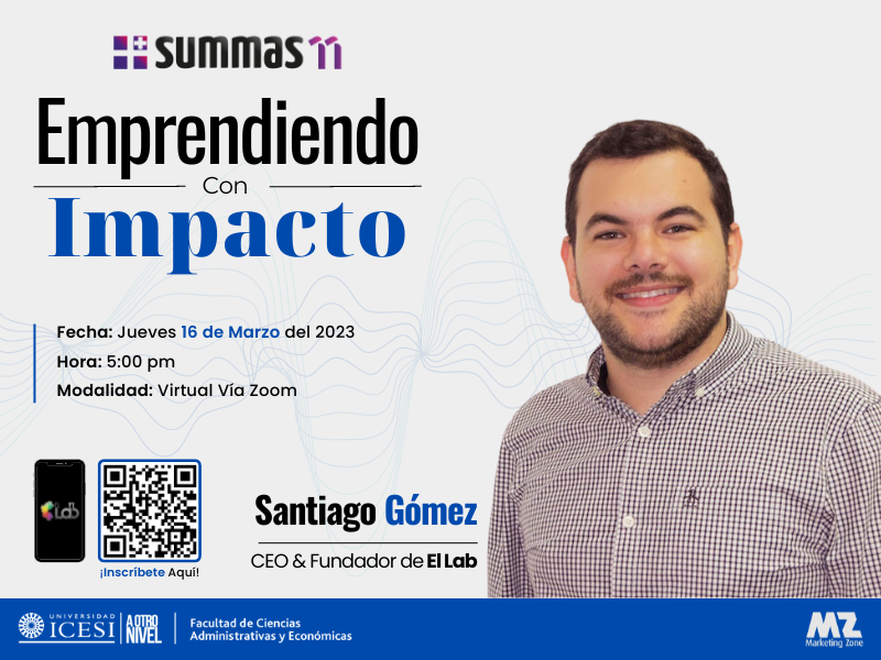 Marketing Zone y los estudiantes de la materia: Individuo, Sociedad y Consumo, invitan a la décima primera versión de SUMMAS, evento dirigido a pequeños y medianos empresarios, emprendedores de la región y comunidad universitaria interesada en encontrar herramientas de marketing para potenciar su negocio. El foro: Emprendiendo con Impacto, será transmitido vía Zoom este jueves, 16 de Marzo, a las 5:00 p.m. Si quieres asistir presencialmente, hay disponibilidad de 25 cupos en el espacio de Marketing Zone (Salón 109A). Inscríbete aquí https://www.icesi.edu.co/e/EmprendiendoConImpacto