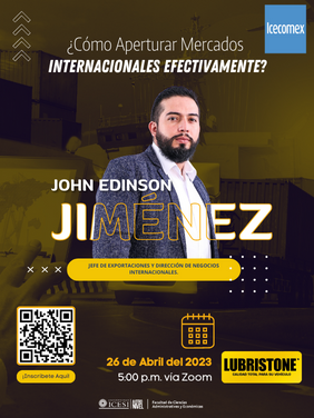 El Consultorio de Comercio Exterior, Icecomex, invita el próximo 26 de abril a las 5:00 p.m., al foro ¿Cómo aperturar mercados internacionales efectivamente?, que tendrá como invitado especial a John Edinson Jiménez, jefe de Exportaciones y Dirección de Negocios Internacionales en Lubristone, quien hablará de la experiencia, los aciertos y desaciertos que han tenido en la apertura de nuevos mercados y la forma en la que han logrado un relacionamiento a largo plazo con sus aliados en el exterior. Conéctate aquí https://www.icesi.edu.co/e/AperturaMercados