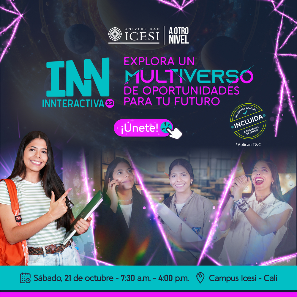 Nos complace anunciar una nueva versión de INNteractiva, un evento que invita a los jóvenes aspirantes a pregrado a Explorar un multiverso de oportunidades en Icesi. INNteractiva 2023-2 es el sábado 21 de octubre a partir de las 7:30 a. m. en nuestro Campus y promete ser una experiencia enriquecedora para nuestros futuros Icesistas.