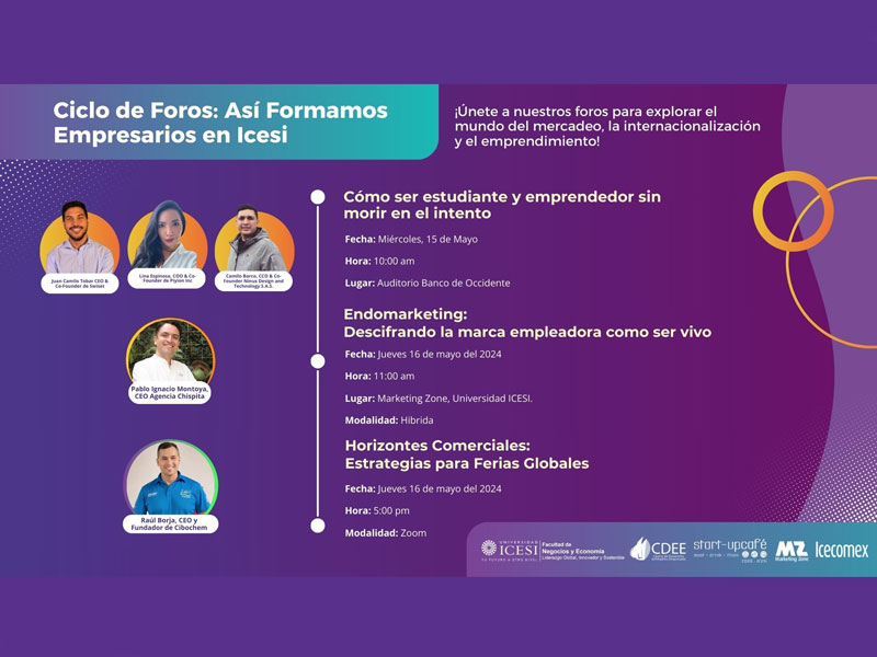 Marketing Zone, el CDEE e Icecomex invitan este 15 y 16 de mayo, desde las 10:00 a.m., a participar del ciclo de foros que se estarán realizando en el marco del evento Así Formamos Empresarios en Icesi.