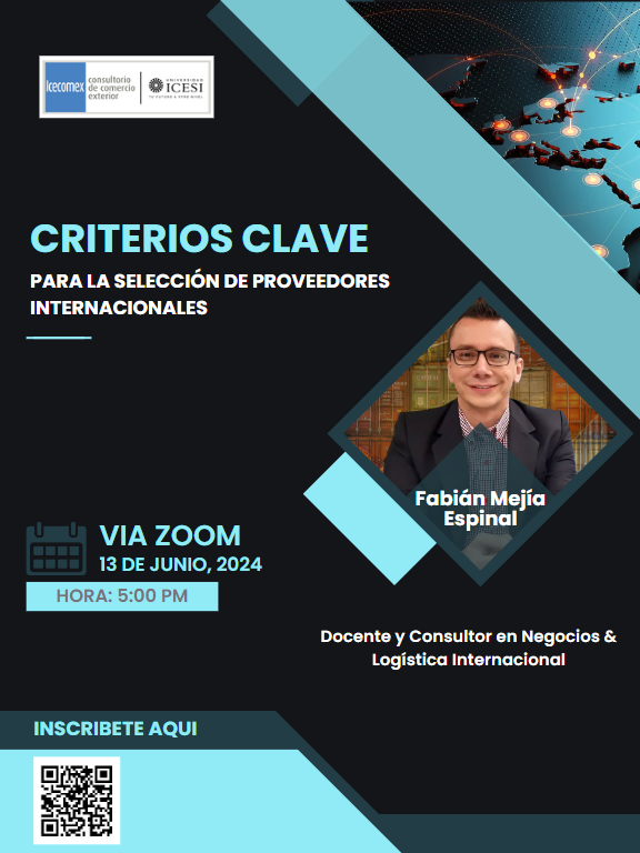 El Consultorio de Comercio Exterior, ICECOMEX, invita a participar en el foro Criterios Clave para la Selección de Proveedores Internacionales, que se realizará este 13 de junio a las 5:00 p.m., por la plataforma Zoom. El Foro contará con la participación del destacado docente y consultor en negocios y logística internacional, Fabián Mejía Espinal. Inscríbete https://www.icesi.edu.co/e/Proveedores