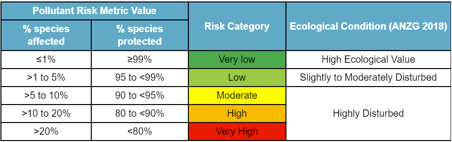 These PRM values can be compared to the three categories of ecosystem condition, as defined in the Australian and New Zealand Guidelines for Fresh & Marine Water Quality seen in the table below.