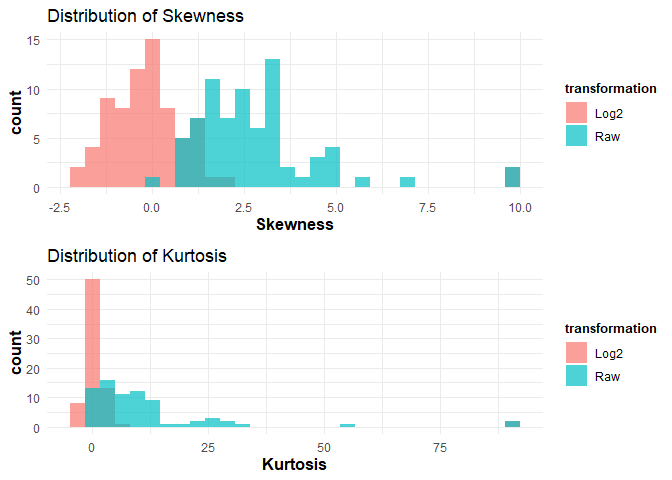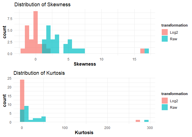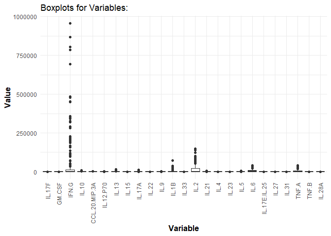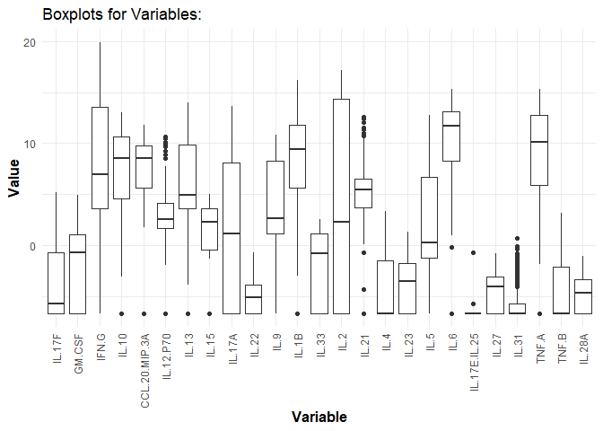 # Using log2 transformation for cytokine values.data_df <- ExampleData1[, -c(3, 5:28)]
