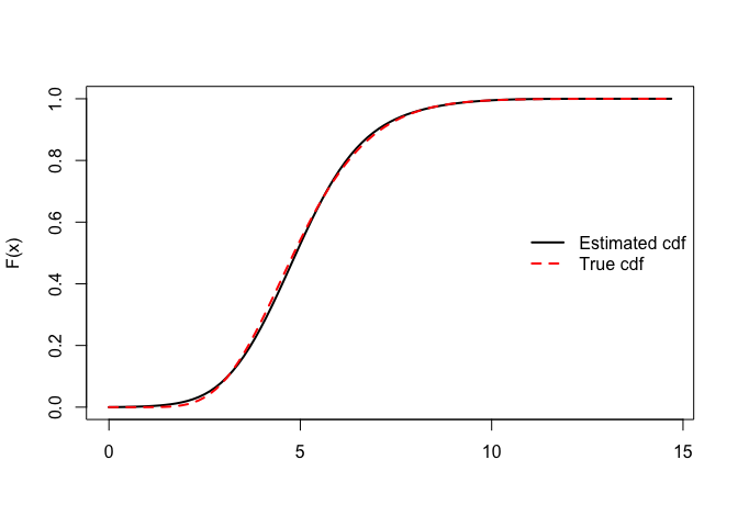 legend=c("Estimated cdf","True cdf"),bty="n")