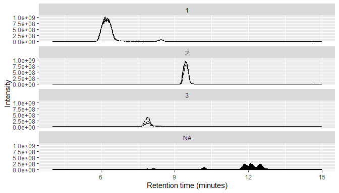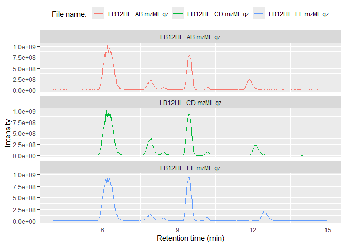 msdata <- grabMSdata(files = msdata_files[2:4], grab_what = c("BPC", "MS1"))Some additional examples can be found below, but a more thorough