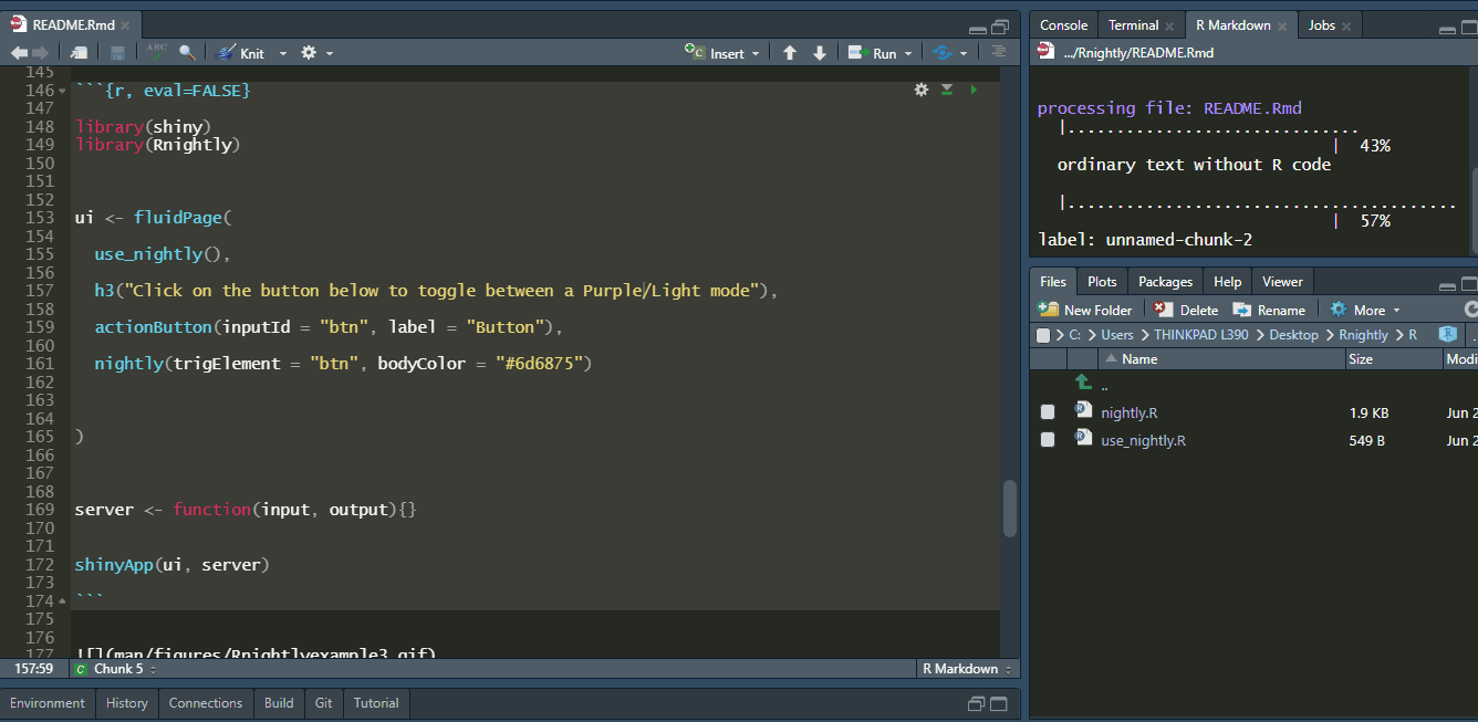 remotes::install_github("feddelegrand7/Rnightly")The Rnightly has two functions: