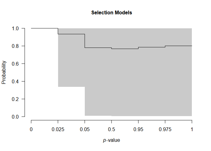 We can further visualize the publication bias adjustments of selection models, visualizing the posterior estimate of the model-averaged weightfunction that shows a sharp decrease in the publication weights of studies with p-values above the “marginal significance” (0.10) level,
