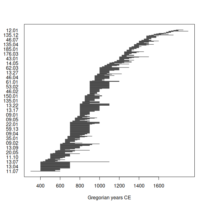 Base R ships with a lot of functionality useful for time series, in particular in the stats package. However, these features are not adapted to most archaeological time series. These are indeed defined for a given calendar era, they can involve dates very far in the past and the sampling of the observation time is (in most cases) not constant.