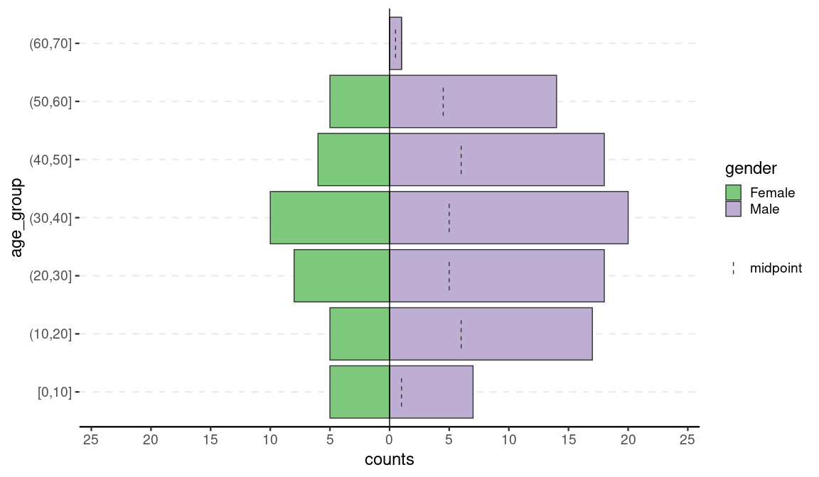 The goal of {apyramid} is to provide a quick method for visualizing census data stratified by age and one or two categorical variables (e.g. gender and health status). This is a product of the R4EPIs project; learn more at https://r4epis.netlify.app/.