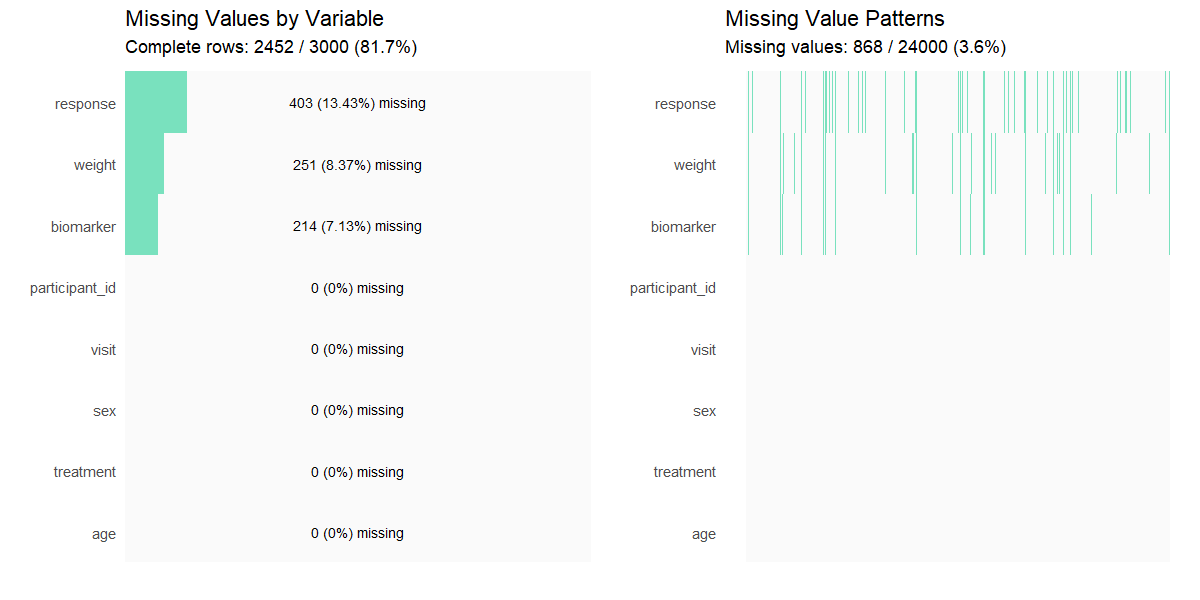 Numeric parameter indicating the proportion (0-1) of missing values to be introduced across numeric variables with fixed proportions (biomarker = 15%, weight = 25%, response = 60%). | 0 |