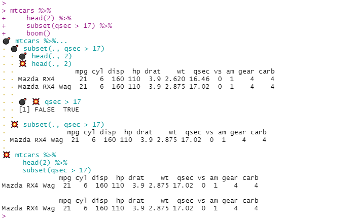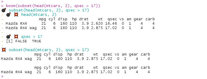 boom(subset(head(mtcars, 2), qsec > 17))