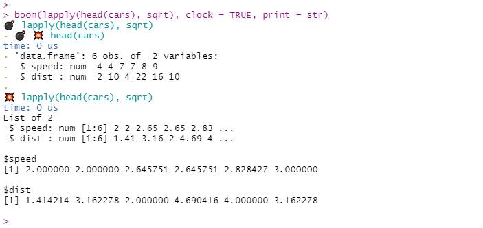 boom(lapply(head(cars), sqrt), clock = TRUE, print = str)