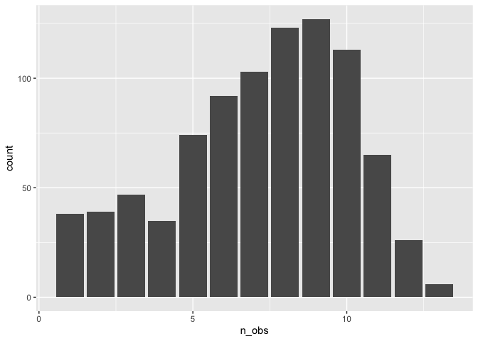 This could be further summarised to get a sense of the patterns of the number of observations: