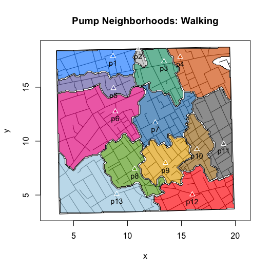 I then wrote functions that compute and visualize walking distances on the map. The value of these functions go beyond the ability to replicate and validate Snow’s efforts. By allowing you to compute hypothetical neighborhoods via selective inclusion or exclusion of pumps or to allow for different measures of proximity (e.g., Euclidean), they also allow you to explore counterfactual scenarios. Ultimately, this can help us to better assess whether we really can use the map to “prove” Snow’s claims.