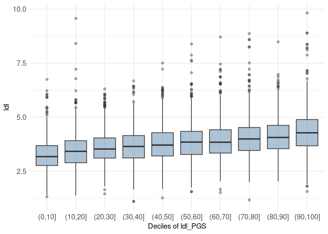 decileboxplot(dataset, prs_col = "ldl_PGS", phenotype_col = "ldl")