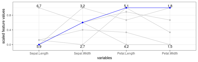 In this example, we train a randomForest on the iris dataset and examine how a given virginica observation would have to change in order to be classified as versicolor.