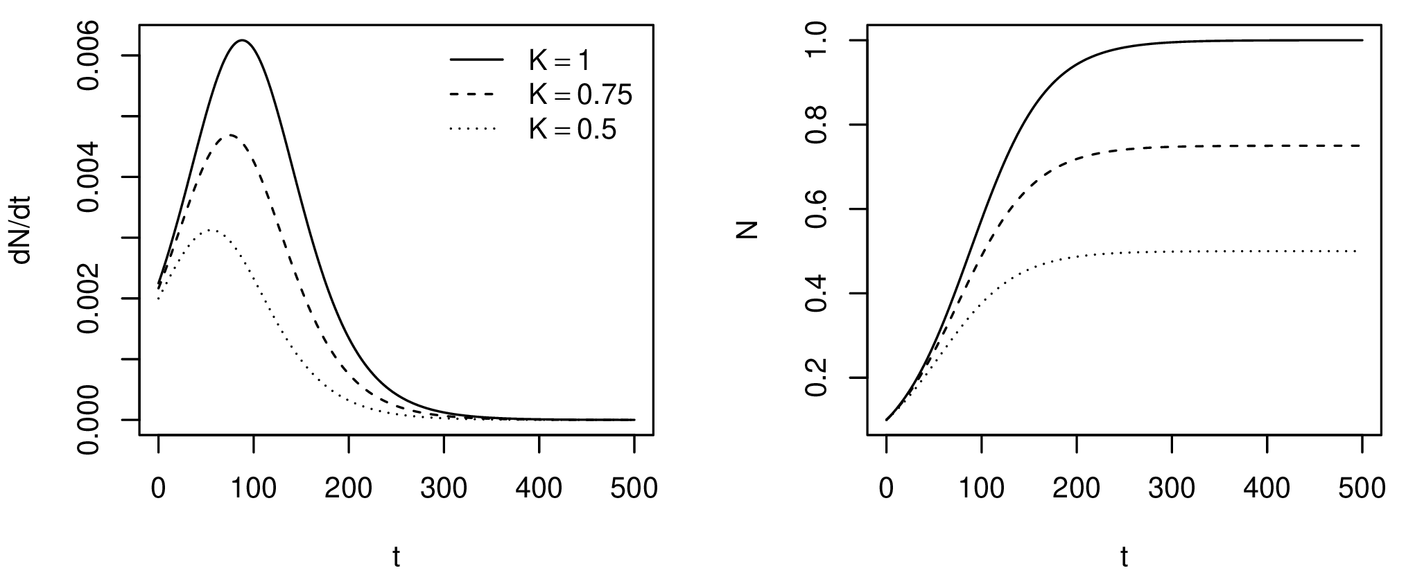Growth is modelled as a density-dependent process by setting an upper boundary or saturation point, defined as the carrying capacity \(K\) (Fig. 1). As the population approaches \(K\), the growth rate \(r\) decreases. It is assumed that population at the saturation point will remain in equilibrium as the birth and death rates cancel each other out. There is more than one proposal on how to model logistic growth; here, the Verhulst-Pearl equation is used for its simplicity (Tsoularis 2001):
