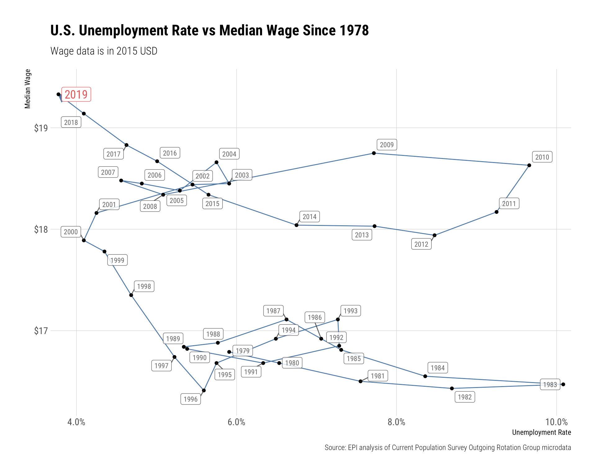 title = "U.S. Unemployment Rate vs Median Wage Since 1978",