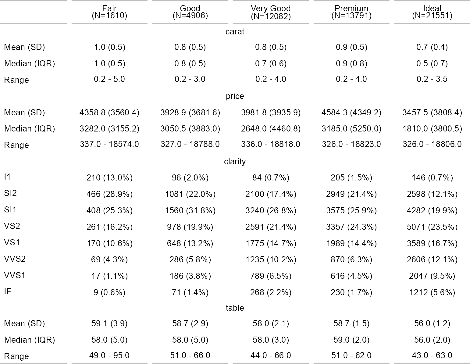 ggplot2::diamonds[, c("cut", "carat", "price", "clarity", "table")] |>