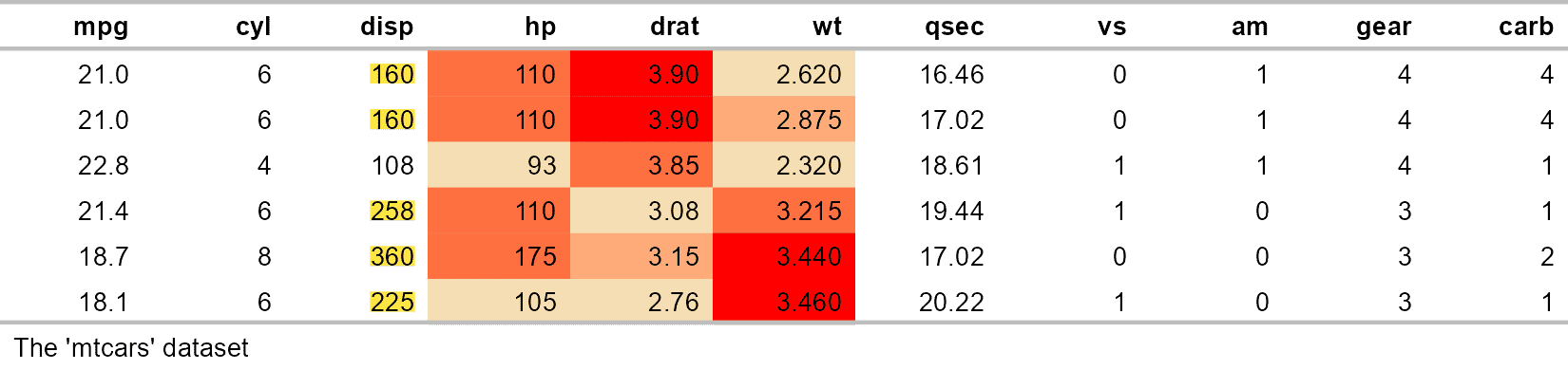 highlight(i = ~ mpg < 22, j = "disp", color = "#ffe842") |>