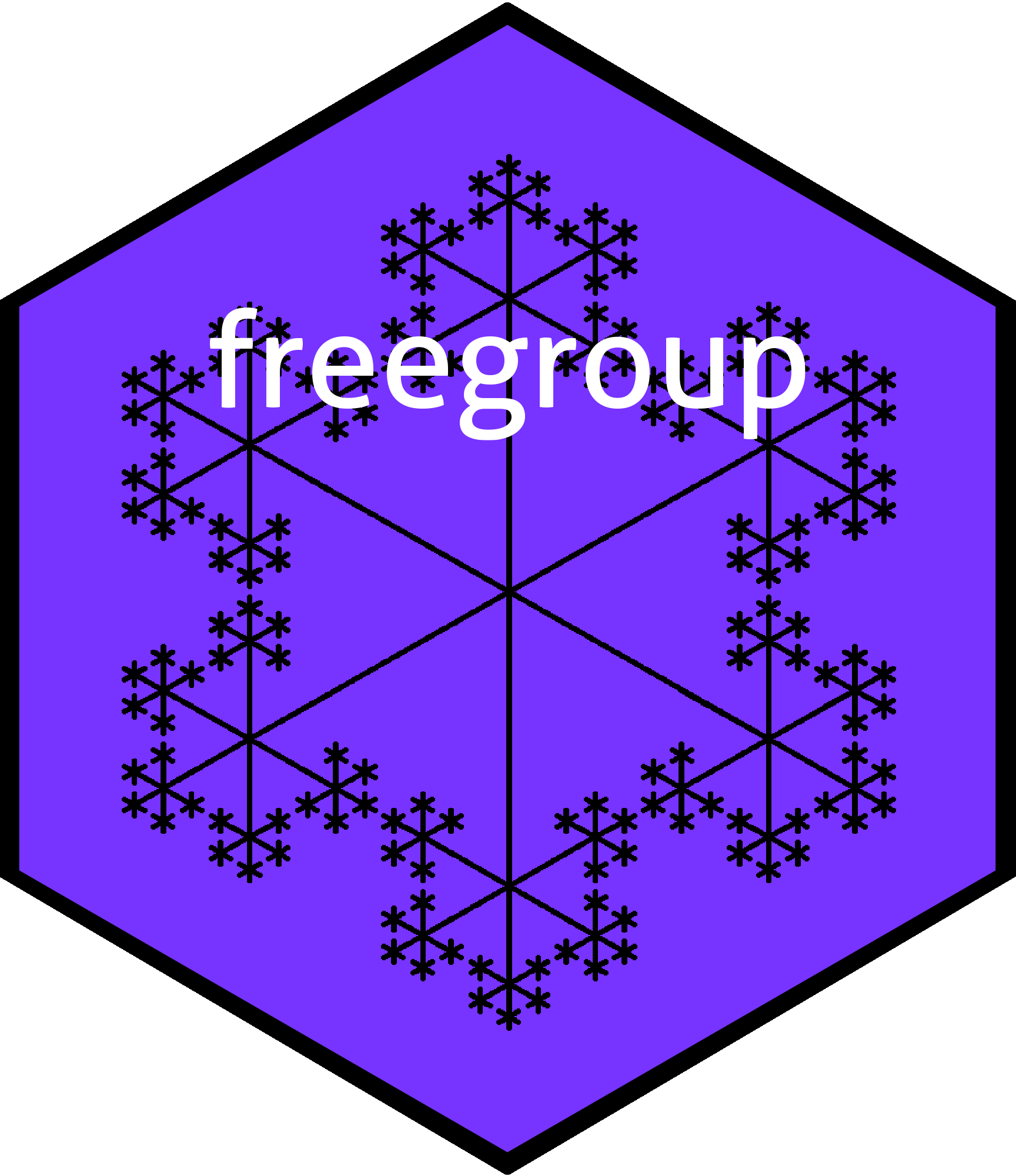 The freegroup package provides functionality for working with the free group in R. A detailed vignette is provided in the package. Informally, the free group is the set of words that are objects like , with a group operation of string juxtaposition. Usually one works only with words that are in ``reduced form’’, which has successive powers of the same symbol combined, so would be equal to ; see how appears to the third power and the term in the middle has vanished.