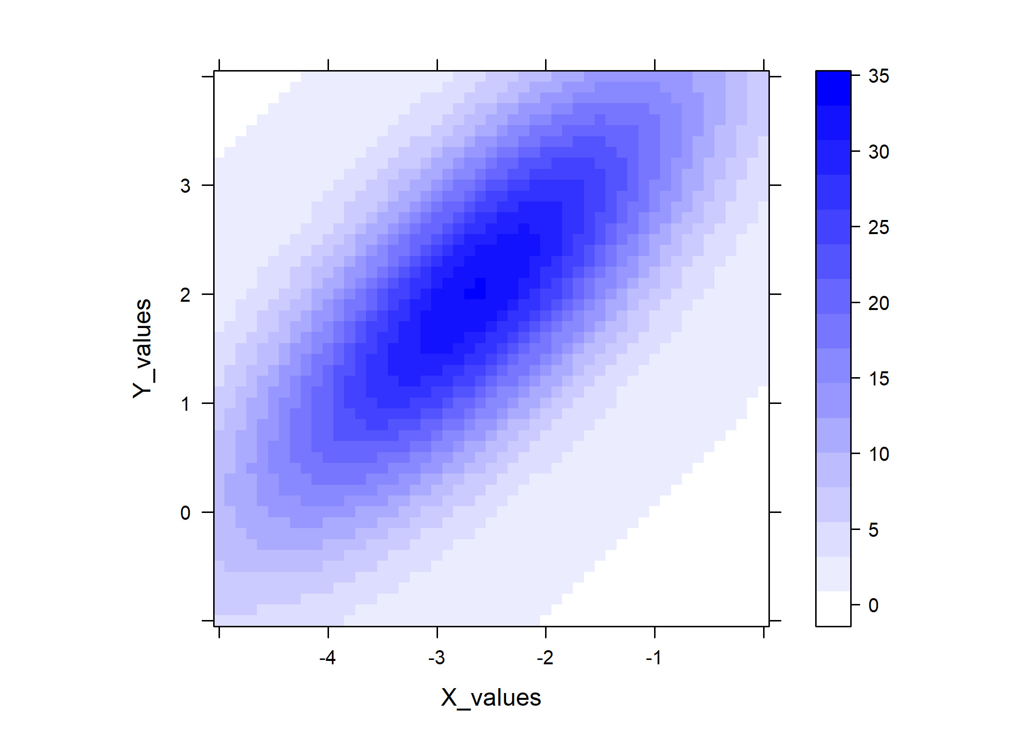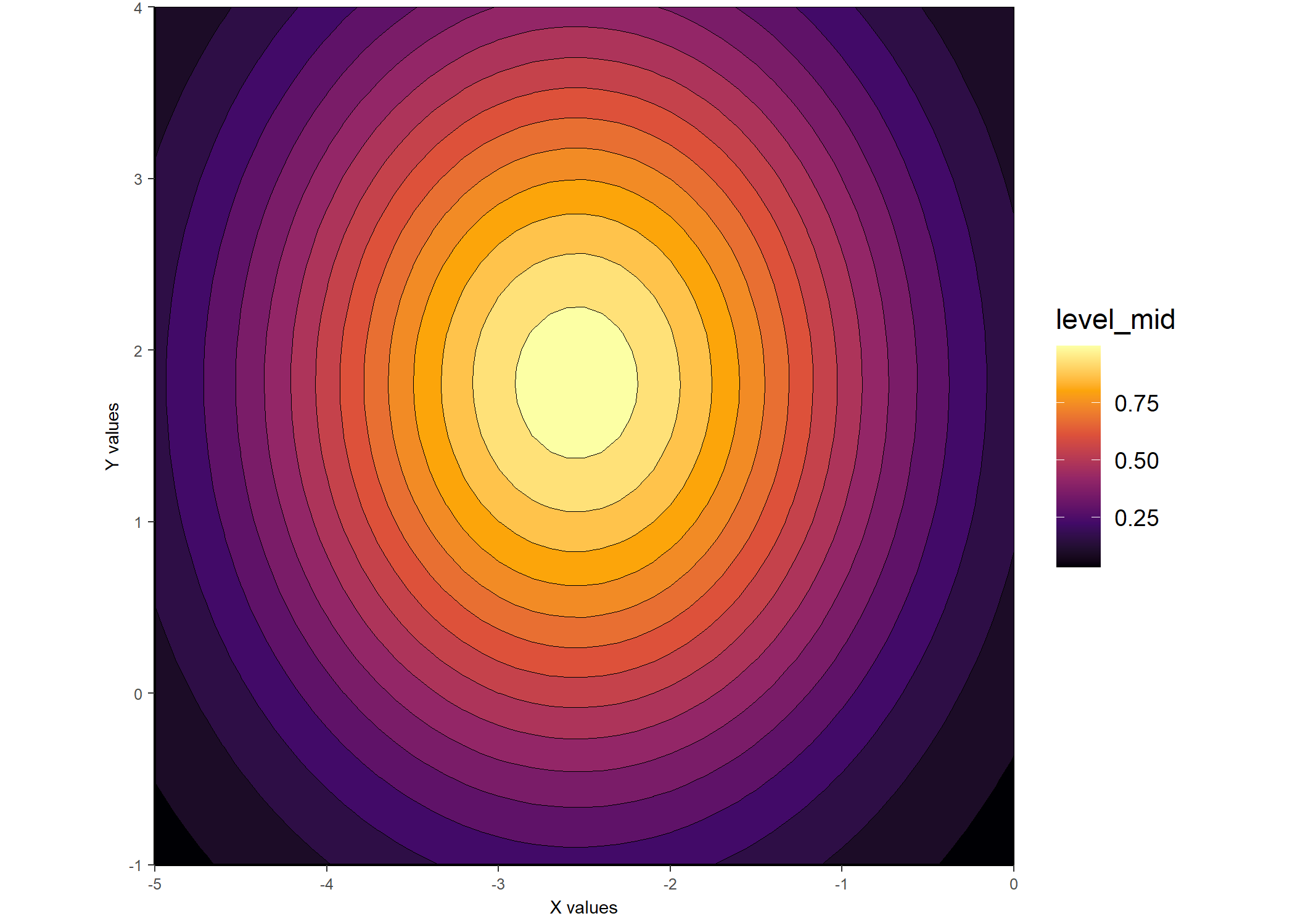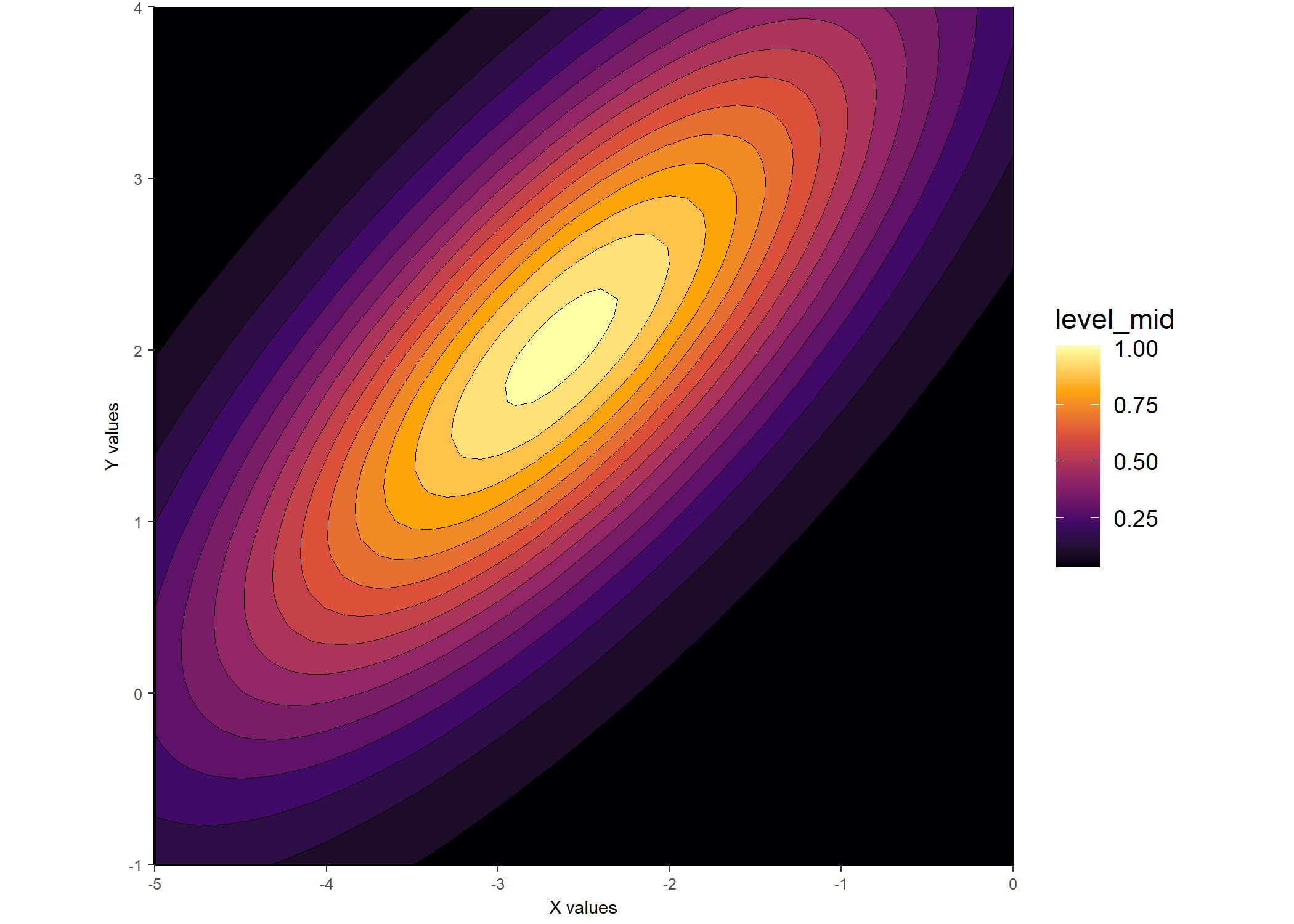 Plotting can then be achieved via ggplot_gaussian_2D(), but note that the data.frame created by predict_gaussian_2D() can be supplied to other plotting frameworks such as lattice::levelplot(). A 3D plot can also be produced via rgl_gaussian_2D() (not shown here).