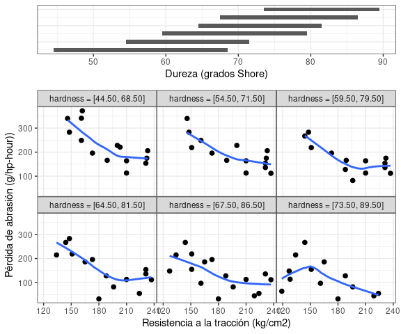 gg_coplot(rubber, x = tensile.strength, y = abrasion.loss, faceting = hardness,