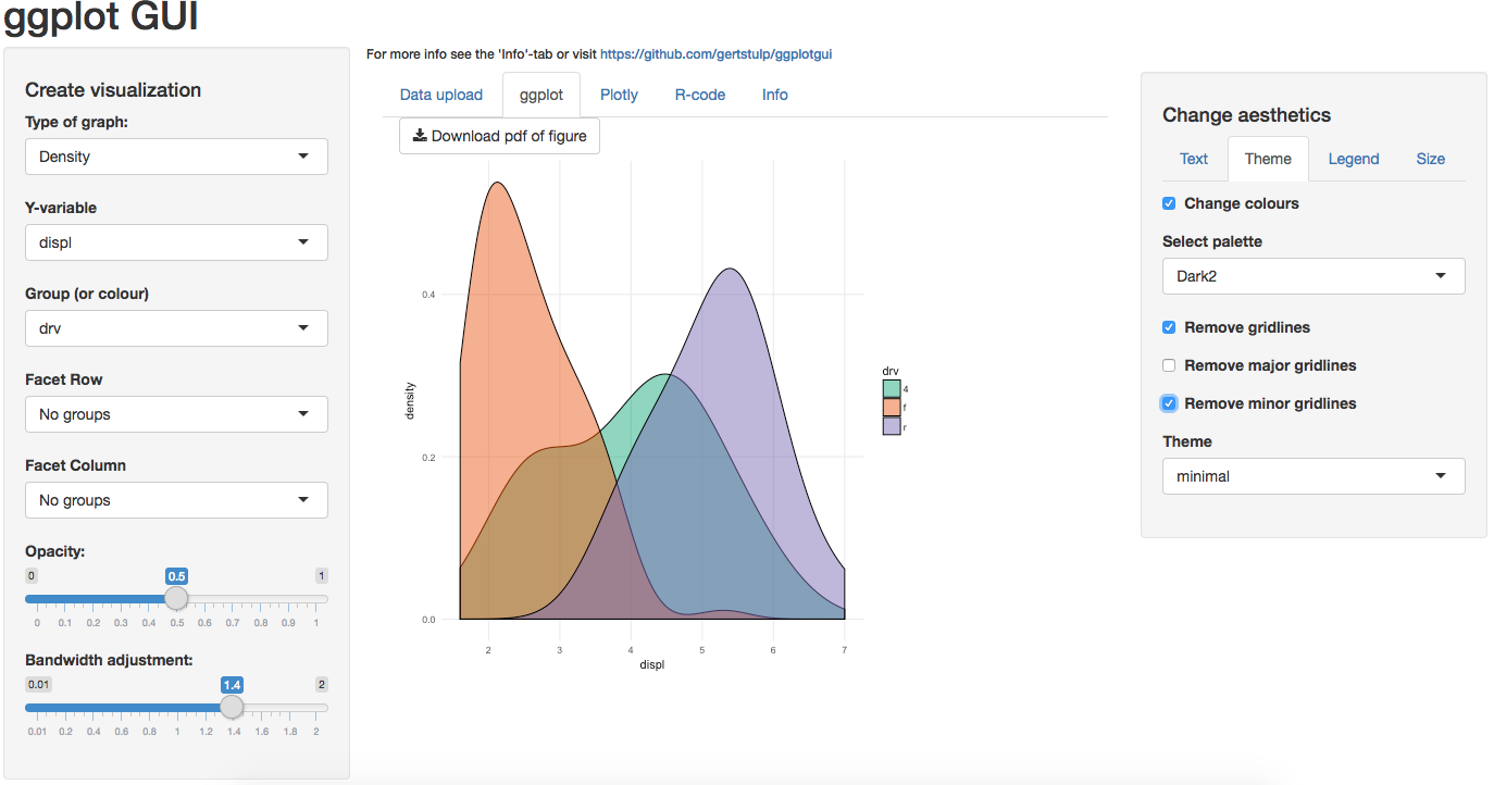 R is amazing, but daunting for many. The programming style of R, compared to the point-and-click style of typical software, is a hurdle for many. Perhaps particularly so for those in the social sciences, whose statistical needs are often met by other software packages. Yet such packages are often very limited in terms of their options to visualize the data at hand. I believe that the amazing visualization-capabilities of R might be one way to get more people to use it. To lower the barrier to start using R, this package allows users to visualize their data using an online graphical user interface (GUI) that makes use of R’s visualization package ggplot. There are two ways of using this functionality: 1) online, where users can upload their data and visualize it without needing R, by visiting this link: https://site.shinyserver.dck.gmw.rug.nl/ggplotgui/; 2) from within the R-environment (by using the ggplot_shiny() function). Importantly, the R-code will also be provided such that the user can recreate the graphs within the R-environment. The main aim (or hope) is to get more people using R and its wonderful (graphing) capabilities.