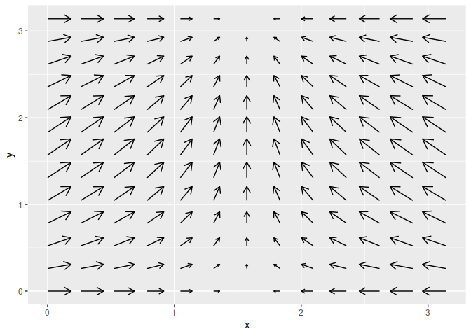 Quiver plots for functions can easily be produced using ggplot aeshetics. When a grid is detected, the size of the vectors are automatically adjusted to fit within the grid.