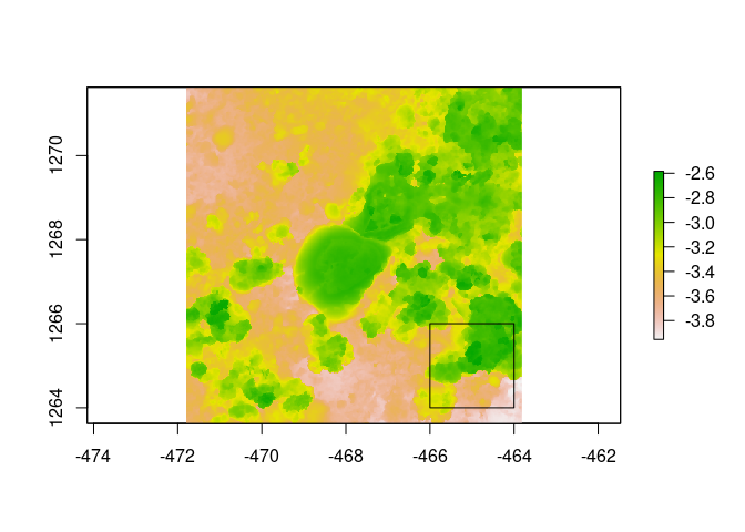 dem <- dem_crop(horseshoe, x0 = -465, y0 = 1265, L = 2, plot = TRUE)