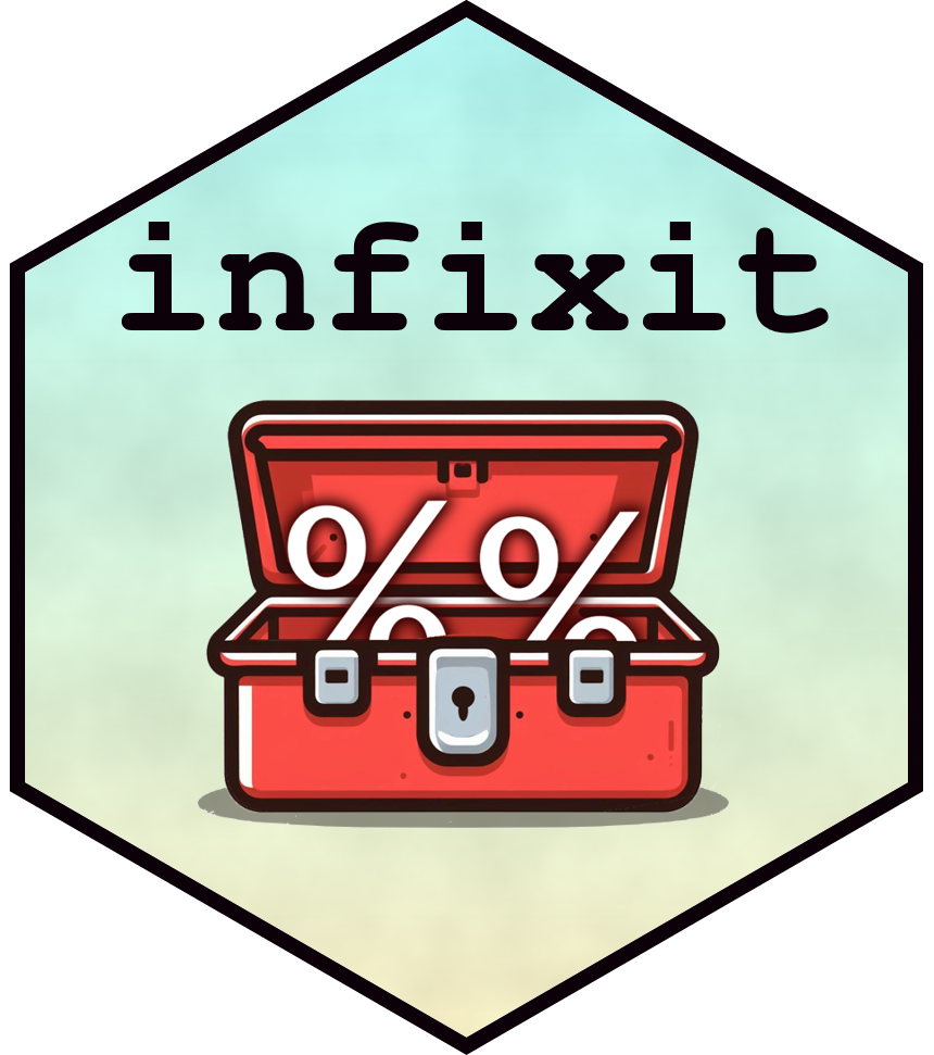 install.packages('infixit')There are currently 12 infix functions packaged with