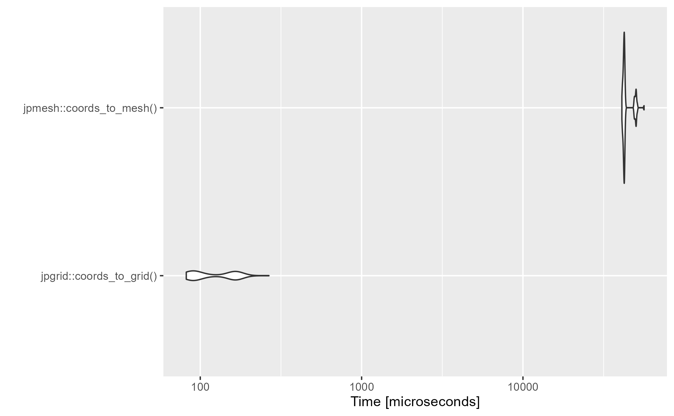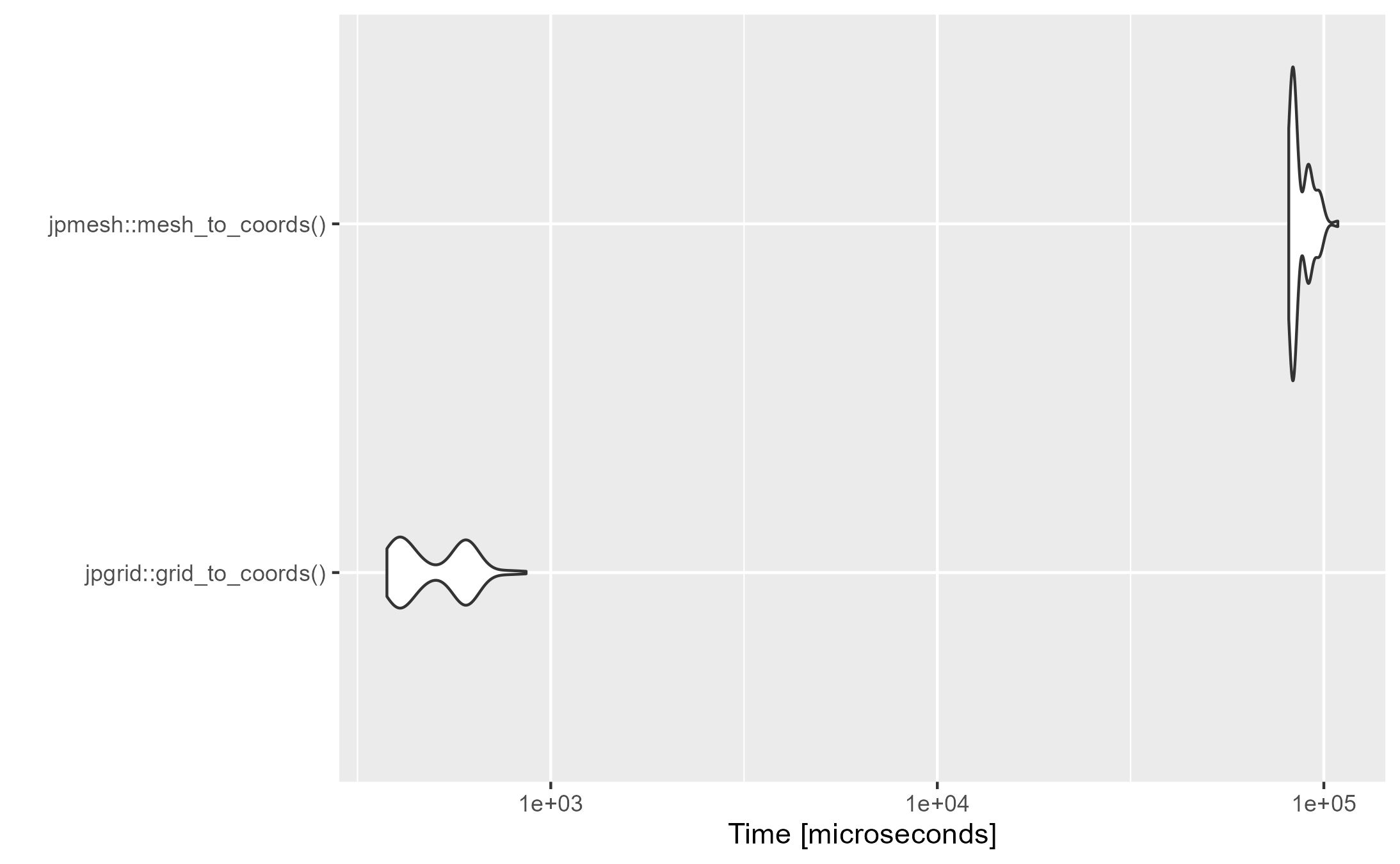 本パッケージのメッシュ・緯度経度間の変換速度は,jpmeshパッケージと比べて数十~数百倍ほど高速です.