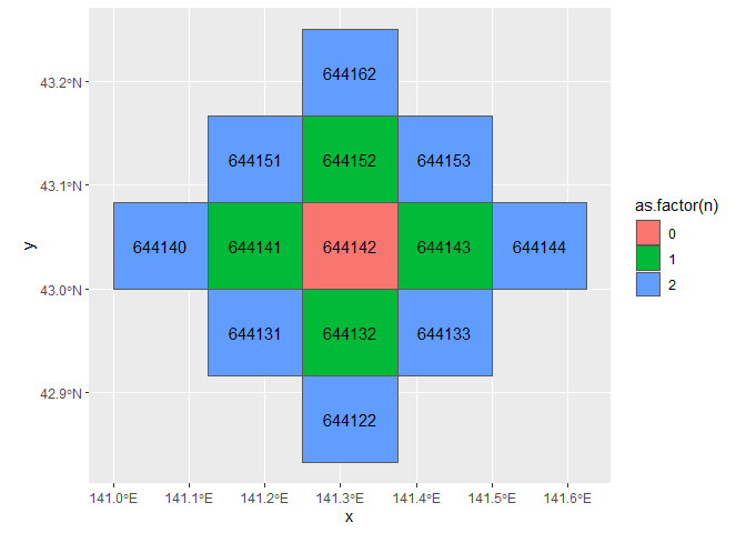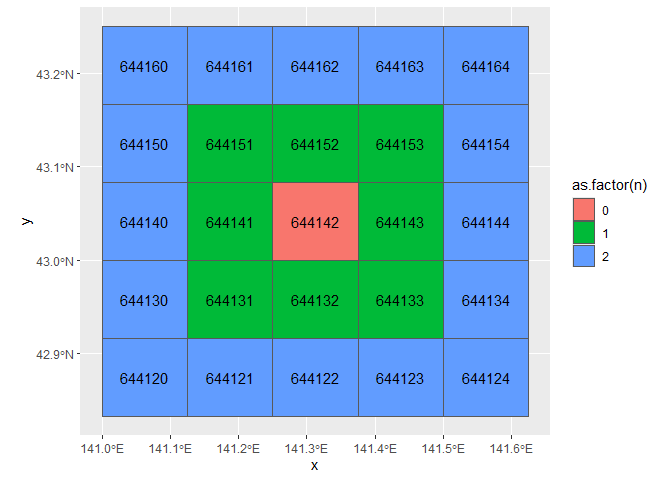 grid_neighborhood()関数は,隣接するメッシュを算出します.