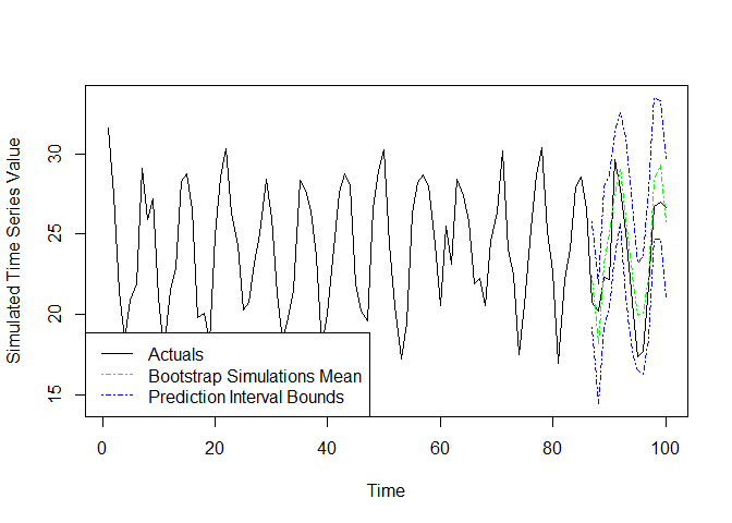 The methodology used to produce forecasts with prediction intervals in this package is based on the description of “Prediction intervals from bootstrapped residuals” from chapter 5.5 of Hyndman R, Athanasopoulos G (2021) https://otexts.com/fpp3/prediction-intervals.html#prediction-intervals-from-bootstrapped-residuals, modified as needed for use with KNN regression. The function knn.forecast.boot.intervals is used to implement this method. The algorithm employed starts by calculating a pool of forecast errors to later sample from. If there are n points prior to the first observation indicated in f.index.in then there will be n - k.in errors generated by one-step ahead forecasts starting with the point of the response series at the index k.in + 1. The first k.in points cannot be estimated because a minimum of k.in eligible neighbors would be needed. The optional burn.in argument can be used to increase the number of points from the start of the series that need to be available as neighbors before calculating errors for the pool. Next, B possible paths the series could take are simulated using the pool of errors. Each path is simulated by calling knn.forecast, estimating the first point in f.index.in, adding a sampled forecast error, then adding this value to the end of the series. This process is then repeated for the next point in f.index.in until all have been estimated. The final output interval estimates are calculated for each point in f.index.in by taking the appropriate percentiles of the corresponding simulations of that point. The output is returned as a list with the upper and lower prediction interval bounds based on the supplied confidence level, as well as the mean and median of the simulated points for each observation in the forecast index. All B simulations can be returned if desired using the optional return.simulations = TRUE argument. Below we have an example, where we generate an interval forecast at the 95% confidence level, and plot the results. Note that the mean forecast from this function may differ from the point forecast generated by knn.forecast. This difference is driven by the random sampling of residuals to generate the simulated paths, as well as the behavior of adding simulated points in a given path to the list of eligible neighbors when repeatably calling knn.forecast.