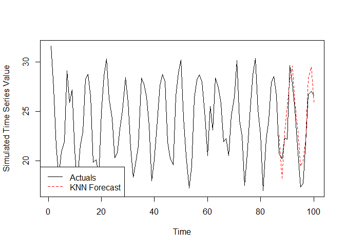 K nearest neighbors forecasting is implemented in this package through the function knn.forecast. Using a provided similarity matrix, which is not required to be calculated using S_w specifically, the function will perform K Nearest Neighbors regression on each point in a specified index f.index.in, returning the mean of the identified, k.in, neighbors in the response series y.in.