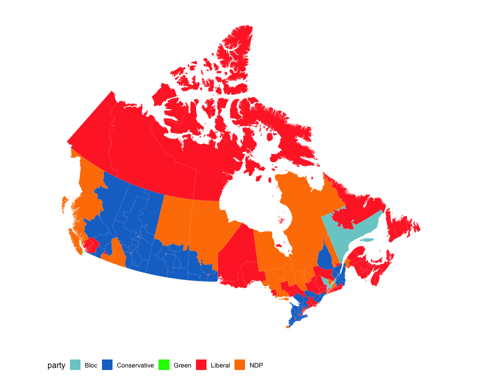 Perhaps you are interested in provincial election results, not federal election results. That is also ok. Try plotting the Quebec 2018 provincial election results: