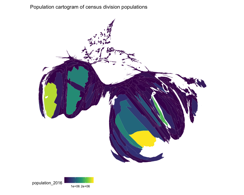mapcan() can also be used to plot population cartograms. Based on the geographic distribution of Canadians (most Canadians live near the US border and very few live in the north), these maps are highly distorted. Shading the census divisions by population size shows how the cartogram inflates divisions with larger populations (i.e. Vancouver, Edmonton, Calgary, Toronto, and Montreal all become larger).
