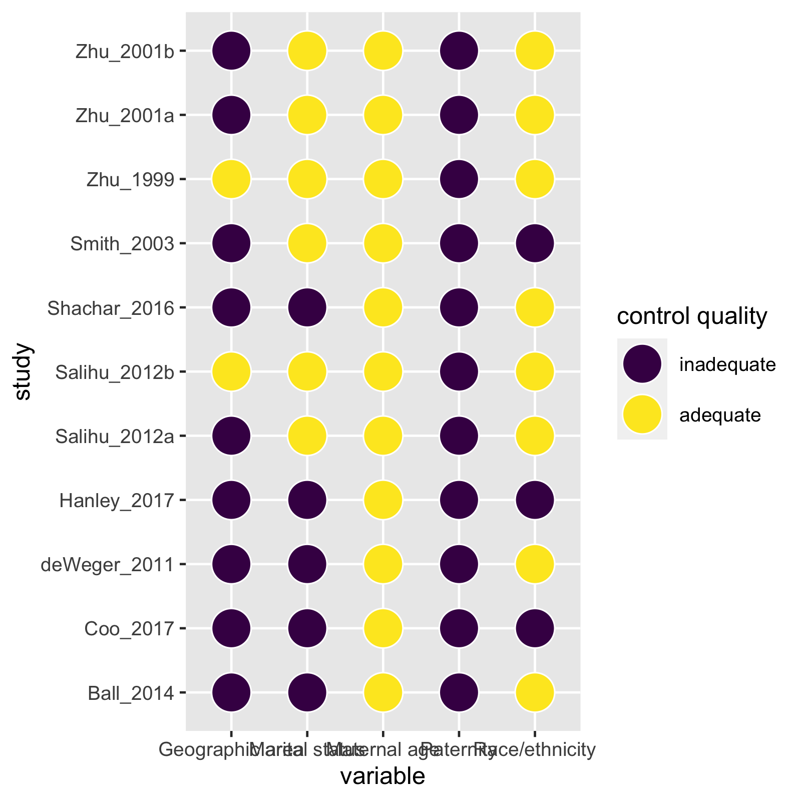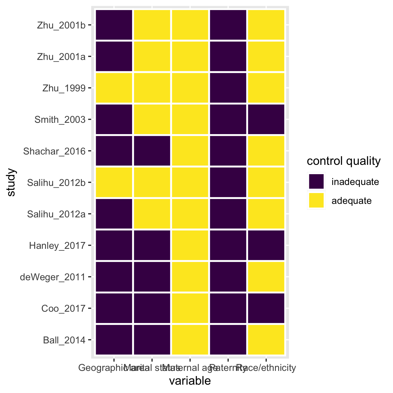 #>  1 Sociodemographics Maternal age Y             Zhu_2001a    adequate