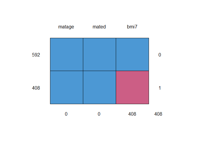 descMissData(y="bmi7", covs="matage mated", data=bmi, plot=TRUE)