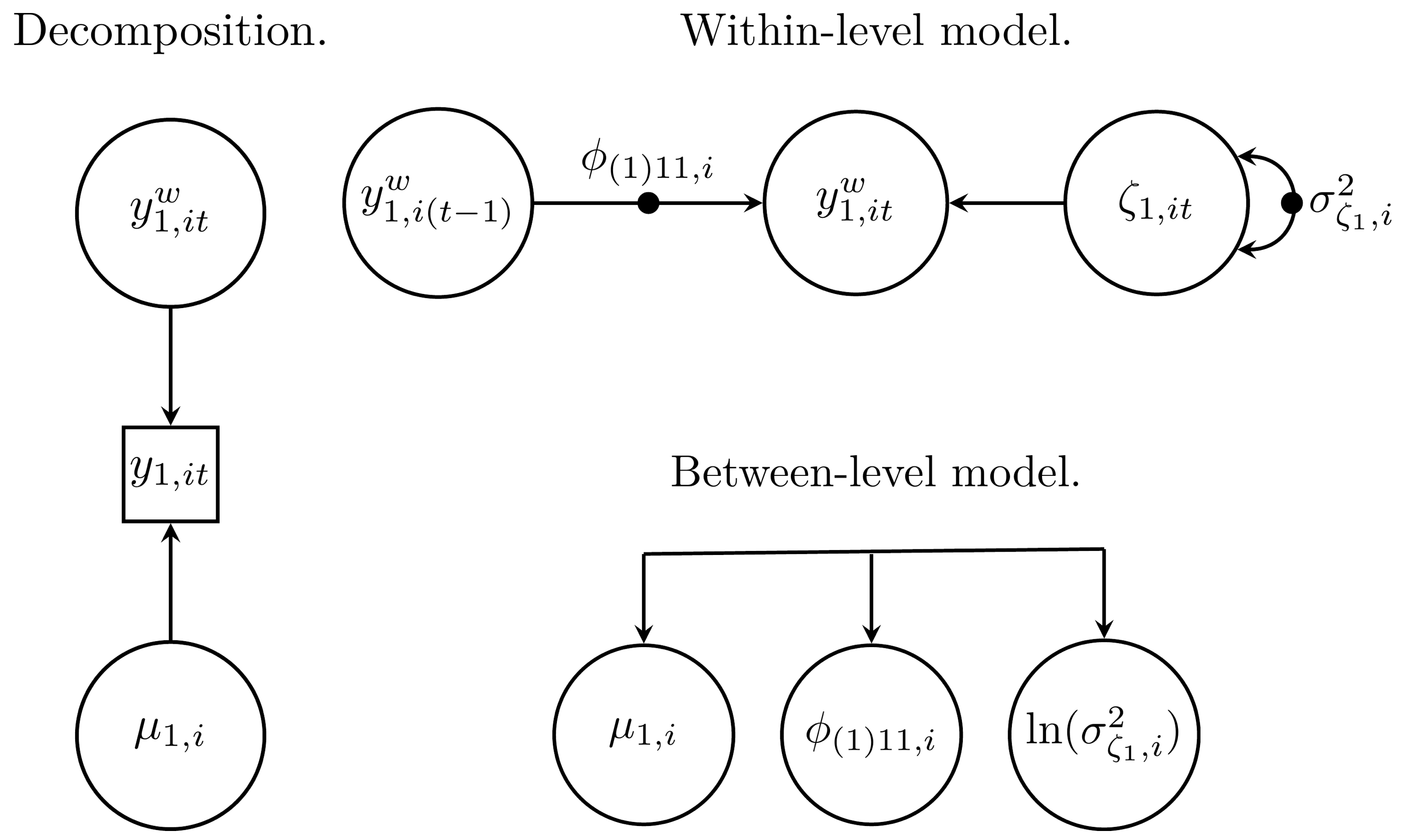 mlts_model_formula(ar1_model)\[ \begin{gathered} \begin{bmatrix} y_{1, it} \\ \end{bmatrix} = \begin{bmatrix} \mu_{1,i} \\ \end{bmatrix} + \begin{bmatrix} y_{1, it}^w \\ \end{bmatrix} \end{gathered} \]