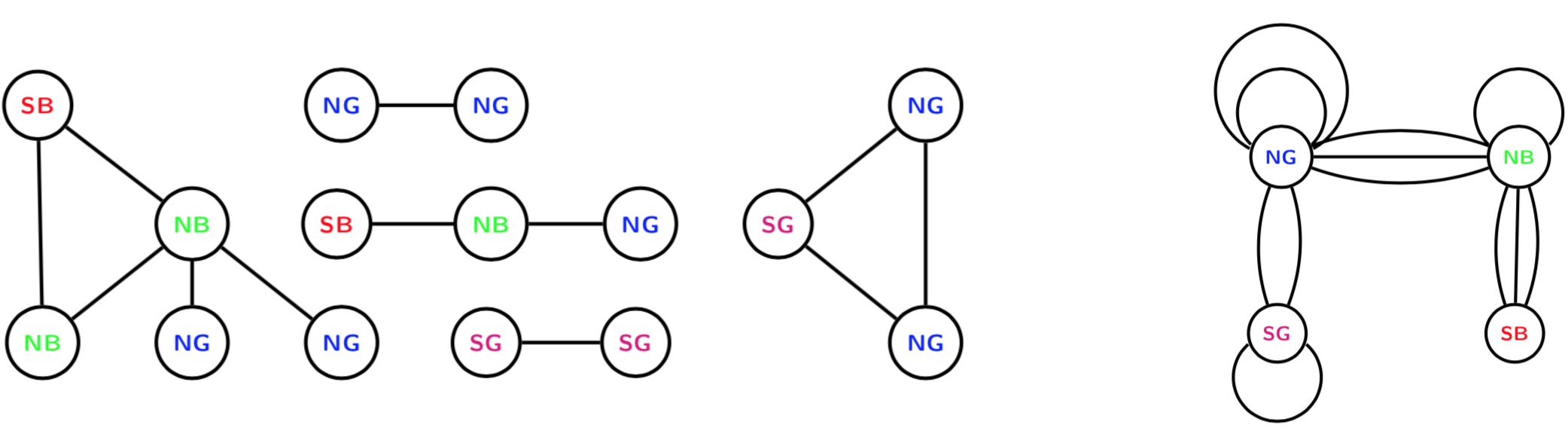 devtools::install_github("termehs/multigraphr")Multigraphs are network representations in which multiple edges and edge loops (self edges) are permitted. These data structures can be either directly observed or aggregated by classifying or cross-classifying node attributes into meta nodes. For the latter case, within group edges correspond to self-edges. See example below where the original graph with 15 nodes and 12 edges (left) is aggregated based on node categories into a small multigraph with 4 nodes (right).